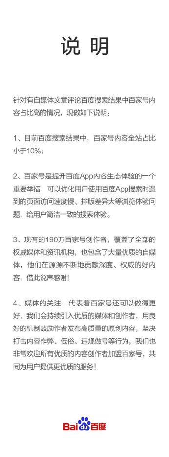 当时百度还就此次进行了回应,称百家号内容全站占比仅10%,百家号是提升百度App内容生态体验的一个重要举措,可以优化用户搜索时遇到的页面访问速度慢、排版差异大等浏览体验问题,给用户简洁一致的搜索体验。