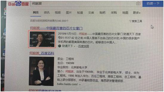 而这篇文章的配图就是AMD的苏姿丰。之后随着事件影响力扩大、错误被发现,百度或许做了调整。目前搜索“何庭波”,在多个百家号的新闻链接之后首先显示百度百科,照片无误。