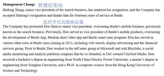 除了财务数据,百度2019年一季报同步披露了管理层变动信息,百度搜索公司总裁向海龙已离职,搜索公司战略转型为移动生态事业群组,沈抖晋升为高级副总裁,全面负责移动生态事业群组工作。