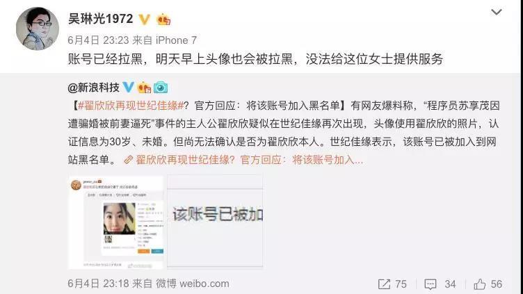 百合佳缘CEO 吴琳光1972转发这一消息称:“账号已经拉黑,明天早上头像也会被拉黑,没法给这位女士提供服务”。