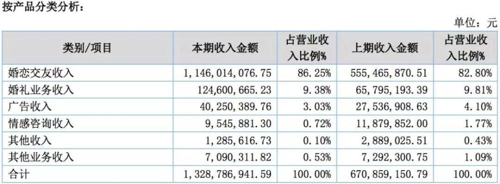 百合网2018年财报显示,婚恋交友收入达到了11.46亿元,占比达到了86.25%。