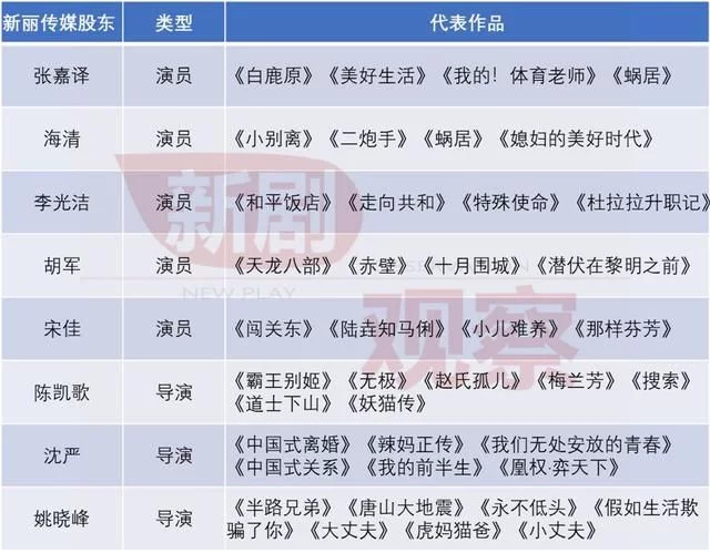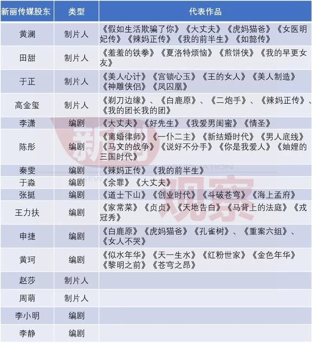 除了上述股东外,新丽传媒还通过协议的方式,绑定了包括导演刘惠宁(《半路夫妻》、《你是我兄弟》)、宋晓飞(《情圣》)、简洵钊(《杜拉拉追婚记》)、刘进(《白鹿原》、《一仆二主》)、陈玉珊(《我的少女时代》)等知名导演,申捷(《白鹿原》编剧)、马伯庸、流潋紫(《甄嬛传》编剧)等知名编剧。