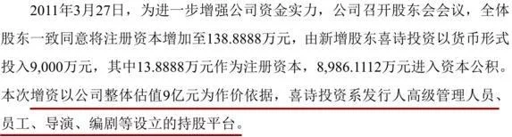 2011年3月,喜诗投资按照9亿估值对新丽传媒增资9000万元,在不到1年的时间里,新丽传媒的估值便如坐上了火箭一般蹿升了34.5倍。