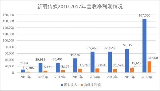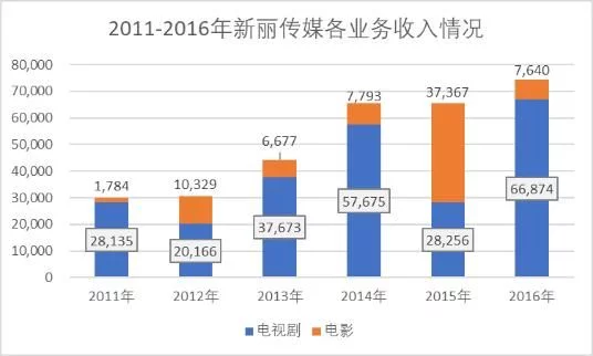 在新丽传媒的经营业绩历史上有过两次爆发增长阶段。第一阶段是从2010年的不足1亿元到2011年的接近3亿元,第二阶段是从2016年的7.45亿一举上升到2017年的16.7亿元。其背后的增长动力均来自剧集、电影的播映量增加。
