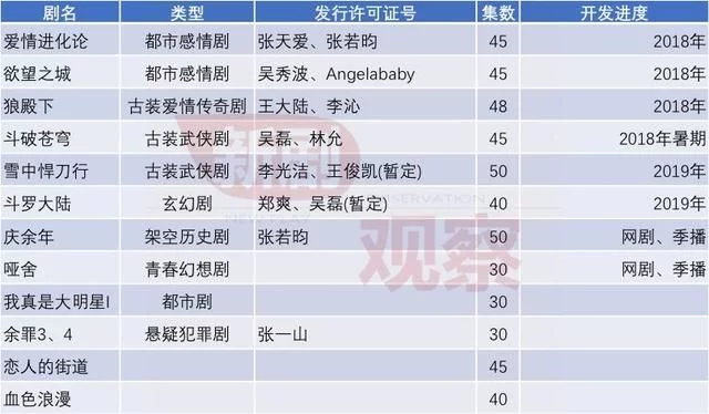 从公司IPO的募投项目及其他公开信息中,小编整理了新丽传媒剧集开发情况,电视剧方面,今年重磅的作品包括张天爱、张若昀的《爱情进化论》、波叔、天宝的《欲望之城》、《狼殿下》以及S级IP《斗破苍穹》、《斗罗大陆》、《余罪3、4》。