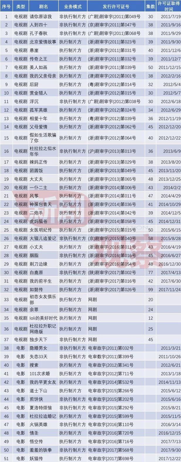 2011年新丽出品了《北京爱情故事》,2017年则出品了《我的前半生》、《如懿传》、《悟空传》、《羞羞的铁拳》、《妖猫传》。第一次的爆发使得新丽跻身一线影视公司,而第二次的爆发,则使得新丽传媒成为影视行业的龙头公司之一。