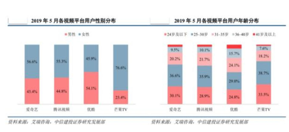 另一组来自艾瑞咨询的数据显示,爱奇艺、腾讯视频用户画像较为相似,活跃用户中女性占 55%以上,芒果 TV也是年轻女性用户居多。