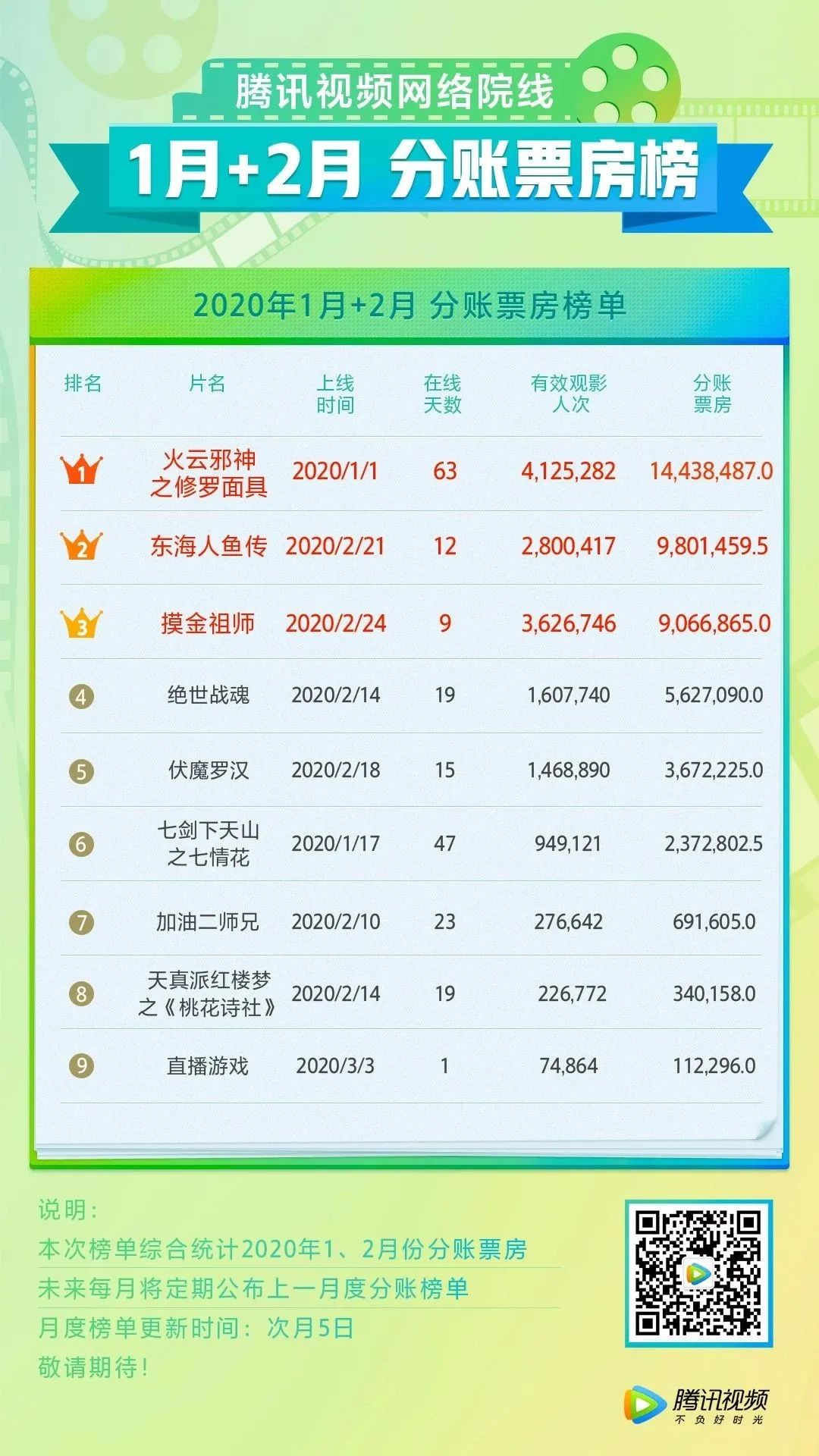 2020年3月5日,终于等来腾讯视频网络电影分账榜单!这是爱奇艺、优酷开放数据透明后,腾讯视频首次公布票房分账,以及最新升级的合作模式。三平台票房数据逐步公开,也更有利于创建公平有序的良好市场环境。