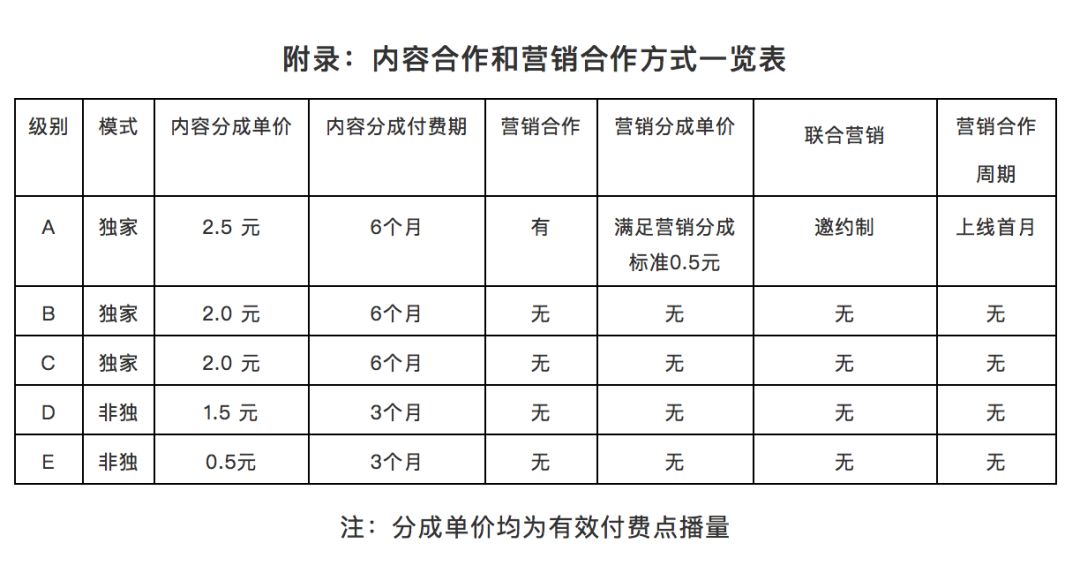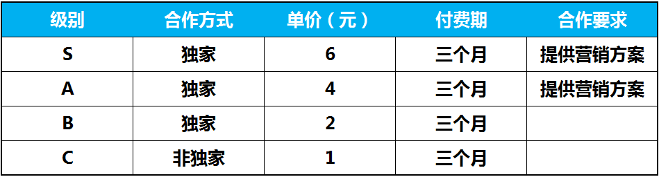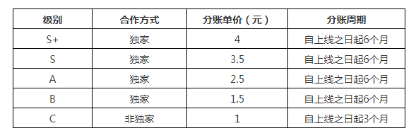 内容定级分为独家S+级4元、独家S级3.5元、独家A级2.5元、独家B级1.5元、非独家C级1元。除了C级影片分账周期为3个月,其余在腾讯视频独家上线影片分账周期均为6个月。