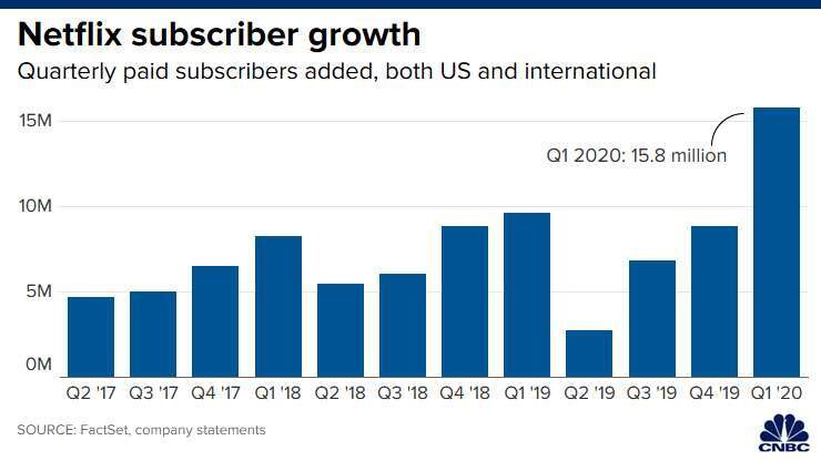 更值得注意的是,这一季度Netflix全球订阅用户数为1.83亿,比去年同期增加22.8%,本季新增订阅用户达到1577万。这个增加幅度远远超过分析师预计的847万(Netflix官方原本预计新增用户数更低,仅700万),并且创下了近一年Netflix的新增用户纪录——2019年Netflix每季度新增订阅用户均未超过千万,2019年Q2Netflix新增用户仅270万。
