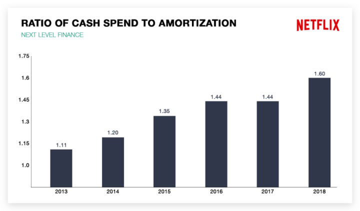Netflix在2019年第四季度财报电话会议上透露,目前Netflix现金支出与摊销之间的比例为1.6,现金投资相对于摊销的1.6倍,这个比例2013年为1.11,而这个数值意味着现金开支与内容摊销之间的时间差,并且与Netflix的自制内容投入息息相关。简单理解而言,随着Netflix自制内容投入增加,公司烧钱速度在逐年增加。即使账面上保持了盈利,显眼的负数自由现金流还是表示Netflix实际处境并不乐观。