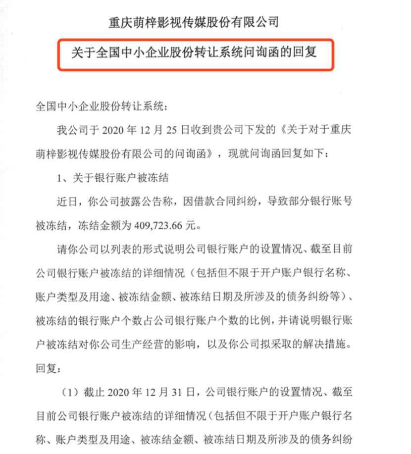很快,萌梓影视就收到了新三板公司监管部发来的《问询函》,要求公司说明银行账户被冻结的详细情况和对生产经营的影响,还有公司存货跌价计提是否充分,公司是否具备偿债能力等多个问题。