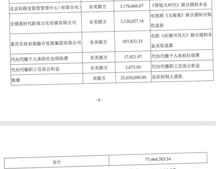 由上表可见,萌梓影视的其他应付款主要由两部分构成:一是影视剧联合摄制分账款,金额5239.12万元,占其他应付款总额的67.63%;二是实际控制人熊雄借款2505万元,占其他应付款总额的32.34%。