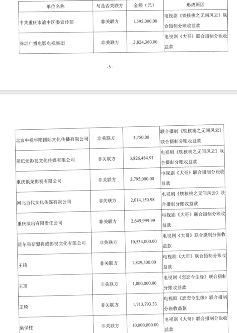 截至2020年6月30日,公司其他应付款一影视剧分账收益款主要包括《铁核桃之无间风云》《大哥》《智能大时代》《恋恋今生缘》等项目应付合作方分账收益款。
