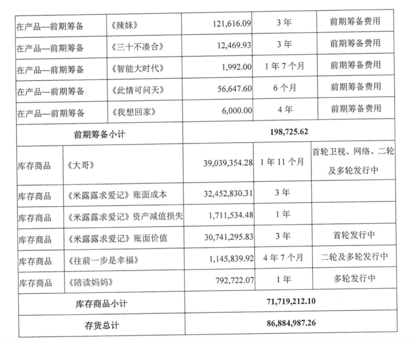 另一方面,萌梓影视还对库存商品进行逐项清理,截至2020年6月30日,电视剧《大哥》尚在首轮卫视及网络发行中,根据市场情况编制的发行计划判断,该剧不存在明显的减值迹象。