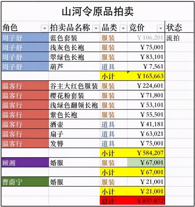 比官方周边再度升级的“售后服务”,恐怕是4月7日优酷在闲鱼上举办的戏服道具拍卖活动,其中包含了温客行的大红色服装、樱花粉套装、酒壶、扇子,周子舒的蓝色套装、葫芦,以及顾湘、曹蔚宁的婚服等,“原版孤品”的名义下自然也引来了粉丝的热逐,最终成交金额超过85万元。