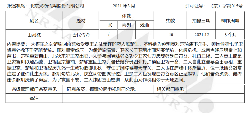 主攻电影业务的上市公司中,光线传媒新增《山河枕》一部电视剧备案。这是光线传媒“杀”回电视剧市场的重点剧目,讲述男女主人公在乱世中携手,重振山河的故事。