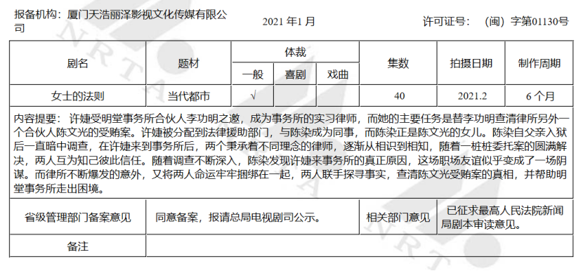 企鹅影视、天浩盛世、丽泽影业联合出品的女性励志题材电视剧《女士的法则》也在第一季度完成备案公示。该剧为腾讯视频定制剧,备案主体为丽泽影业。