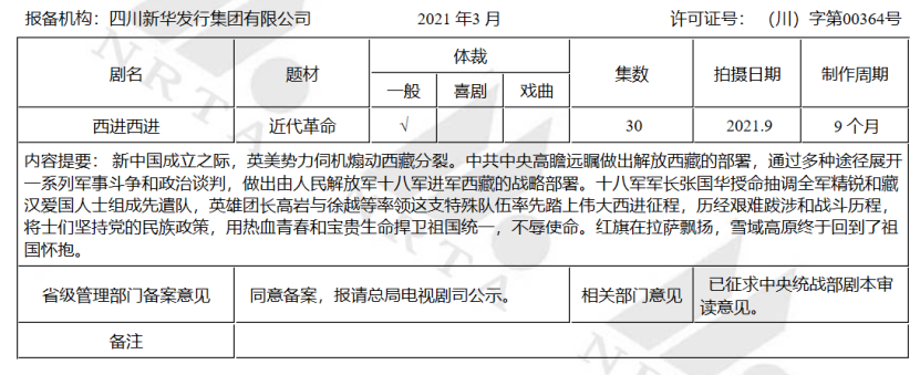 今年同样是西藏和平解放70周年,与党史主题献礼剧“井喷”不同,围绕西藏和平解放的献礼剧数量较为克制。第一季度电视剧备案中,四川新华发行集团有限公司出品的《西进西进》是为数不多的纪念西藏和平解放70周年的剧目。故事讲述人民解放军十八军进军西藏,军长张国华授命抽调全军精锐和藏汉爱国人士组成先遣队,在英雄团长高岩与徐越等率领下,踏上西进征程,捍卫祖国统一。