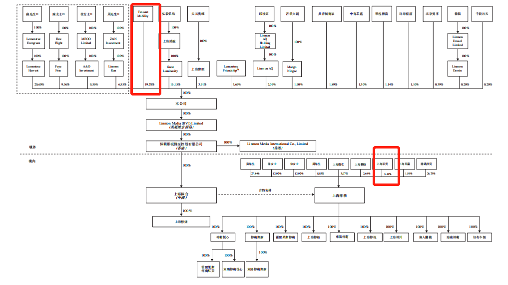 据招股书披露,苏晓、陈菲、徐晓鸥、周元为该公司的主要控股股东,四人持股分别为20.6%、9.56%、9.56%及6.55%。除此之外,腾讯则持股为19.78%,是仅次于柠萌影业创始人苏晓的第二大单一股东,弘毅弘欣则持股为16.15%,是第三大单一股东。