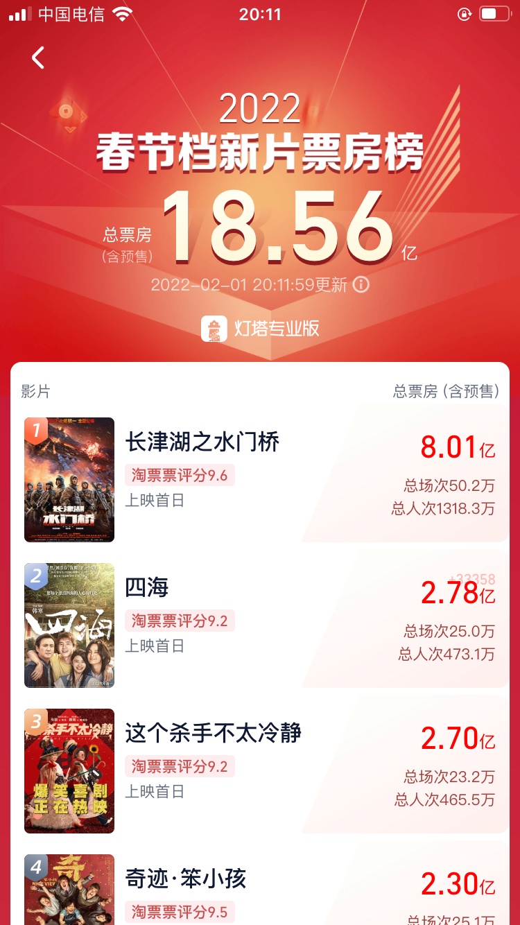 而截至20时11分,2022春节档新片(含预售)总票房已达18.56亿元。