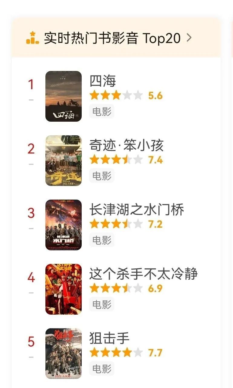 值得注意的是,1日晚间,5部影片的豆瓣评分开出,《狙击手》豆瓣开分7.7,为5部影片中最高;《四海》豆瓣开分仅有5.6,为5部影片中最低;《奇迹·笨小孩》、《长津湖之水门桥》、《这个杀手不太冷静》分别为7.4、7.2、6.9。
