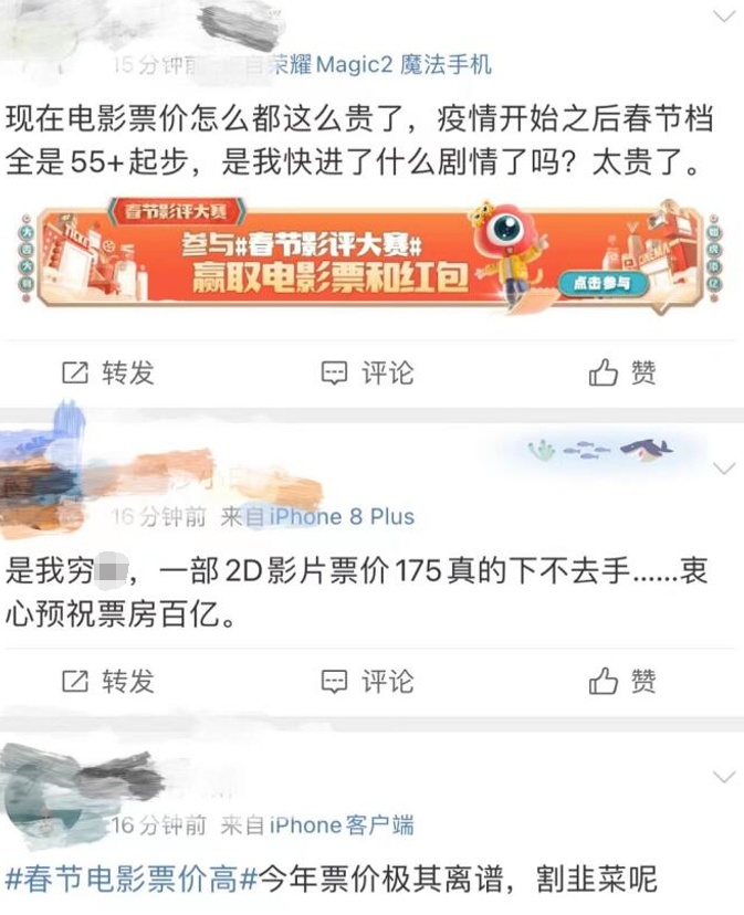 “今年票价极其离谱,割韭菜呢”;“疫情开始之后,春节档全是55+起步,太贵了”……微博上,网友的抱怨不绝于耳。