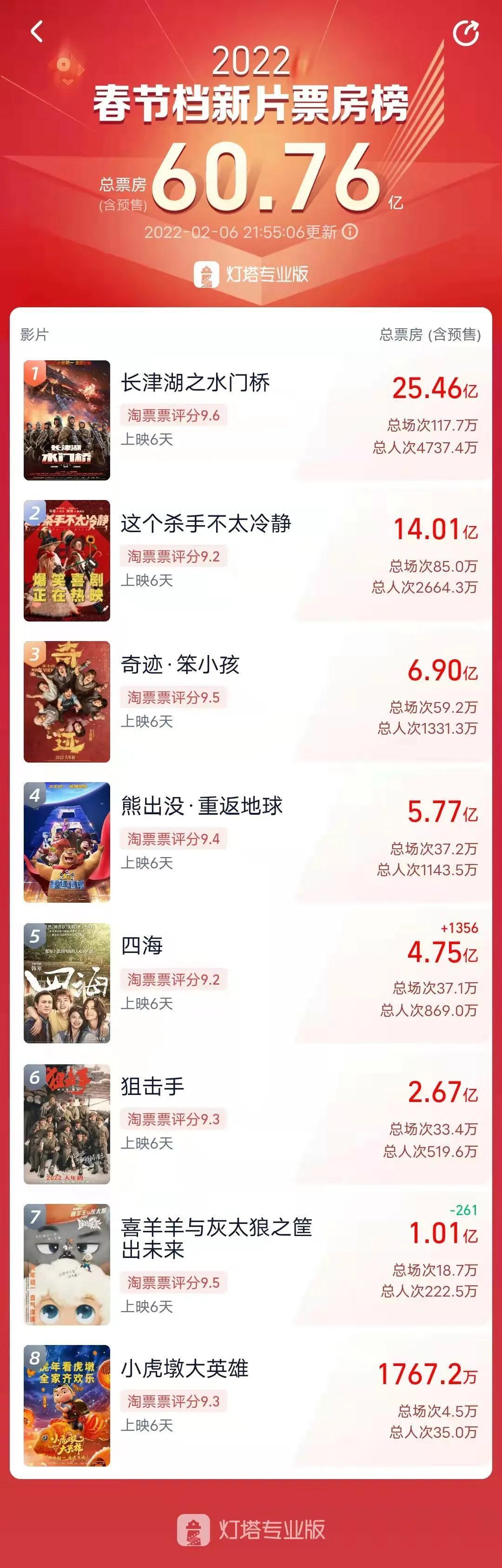 灯塔专业版数据显示,截至2月6日20时,春节档总票房(含预售)突破60亿元。但相比于2021年春节档创下的78.4亿元票房纪录,今年的票房表现可以说是不尽如人意。