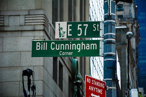 时装产业的致敬模式还不仅止于造型。在他生前好友Nick Nicholson、Derek Blasberg、Nina Garcia等人的请愿之下,纽约市政府批准将第五大道和57街道的街口以Bill Cunningham命名——这里是他常年蹲守寻觅拍摄目标的地方。