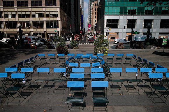 布莱恩公园近期则出现了50把座椅,它们被排成35mm相机的形状,靠背使用与蓝色夹克机器相近的面料。每一把椅子都附有一张Bill Cunningham工作照。这里曾经是他最常出现的工作地点之一,冬夏两季的洛厄尔喷泉构成了他街拍中重要布景。