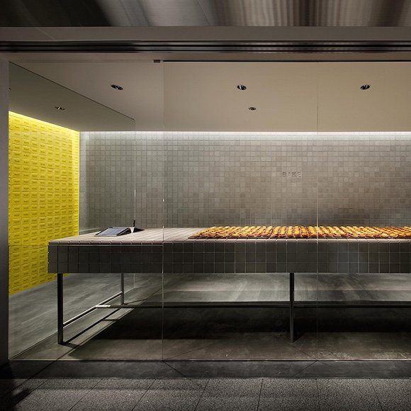 别担心,走进店里,你也并不会因为全灰色的工业化空间而感到心灰意冷。店铺里还有一整面黄色的墙和金属大方桌上的金黄色起司塔两相呼应。