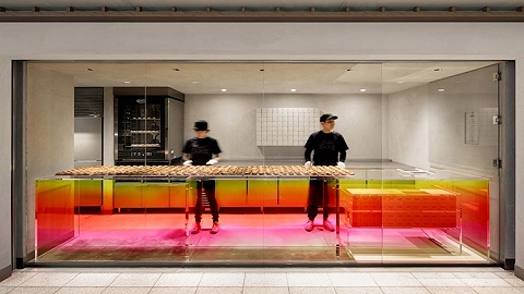 工业风的部分指的是整个空间的内饰装修,烤箱等设备是金属色、现代化的,整个空间从天花板到侧墙再到地面都用了灰色水泥来铺设,店铺的正中央还摆着一张金属制的大方桌。彩虹色指的则是玻璃门上贴出的黄昏渐变色效果——从黄到红再到粉红。从远处看,彩虹色的玻璃为灰色的工业化空间上了色,看着让人忍不住想走近一探究竟。