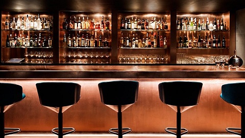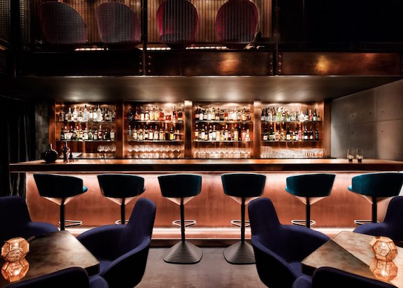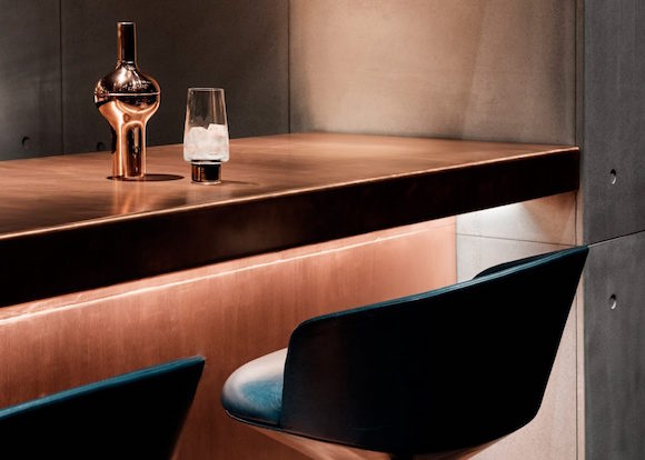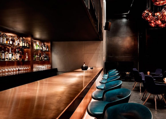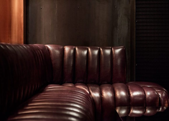 在移门打开后,顾客就能明白“暗黑剧院风”的准确含义。Dixon自己的灯具系列或从天花板上挂下,或摆在吧台和矮几上,发出幽幽的暖光,加上绿色、红色、蓝色的绒面椅子、皮质的沙发以及大理石面的桌子,整个Himitsu散发出浓浓的美式复古奢华味。不过,空间的墙壁和地板依旧朴实,是工业风的粗犷,也是日式设计中常见的极简。