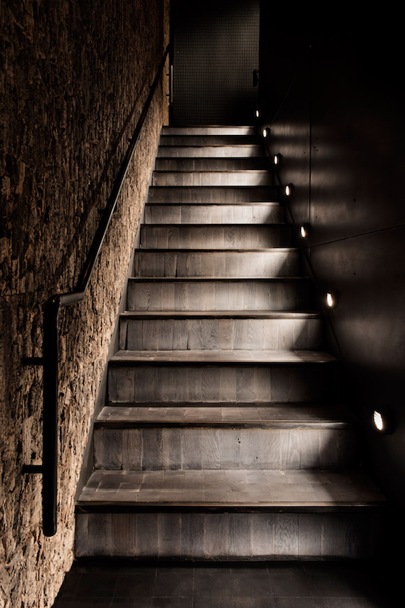 整个空间设计还配合了餐厅的服务流程安排。因为酒吧采用100%预约制,顾客一定要在门前输入预约时得到的密码才能进店,因此在通过楼梯后,Dixon在入口处设计了一个需要密码启动的半日式移门。