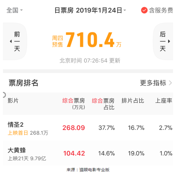 但将《情圣2》与24号同日上映的影片来看,票房还是占据优势的。猫眼电影专业版显示,截至1月23日早间,《情圣2》的预售票房为268.09万,综合票房占比37.7%。而同样是上映首日的《战斗民族养成记》综合票房仅有7.99万。