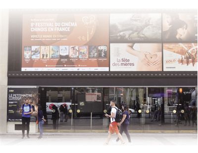 开幕式当天,记者来到位于香榭丽舍大道上的高蒙玛里扬影院,影院大门口上方贴着大幅电影节海报。入口处的信息栏显示着中国电影内容简介和放映时间,不时有路过的行人驻足观看。大厅内,中国电影的海报也摆放在显眼位置。