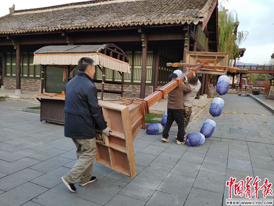 另一个景点“清明上河图”有3个剧组正在拍戏。天色渐晚,道具组架起巨型打光灯,工作人员将拍摄场地内的游客劝离,身着戏服的群演陆续到位。