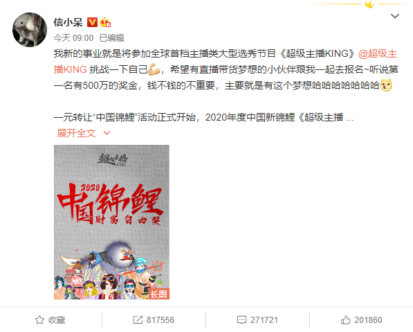 今天上午,信小呆揭秘了「一元转让“中国锦鲤”」的内核,是锦鲤本人要参加一档主播类的选秀节目,而转发信小呆今天的微博,而抽奖获得新锦鲤身份的人,将有机会获得众多X品牌提供的奖品,除了房产和车子,奖品还涵盖了6大种类超100件奖品。