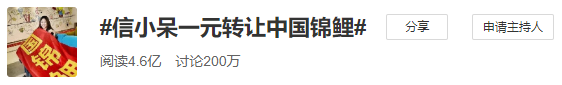 接着,今天早上9点揭晓答案,让信小呆一元转卖“中国锦鲤”的活动荣登微博热搜,截止发稿前,话题#信小呆一元转让中国锦鲤#实现阅读4.6亿,讨论200万,目前此事件还在持续发酵中。