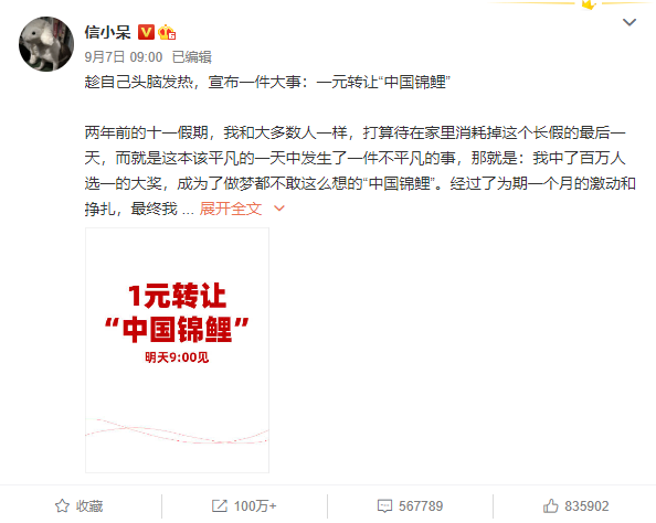 昨晚,信小呆发布了一条「一元转让“中国锦鲤”」,为了赢得更多人信任,甚至讲起了2年前发生在自己身上的故事。无独有偶,莫非锦鲤真的要回来了?