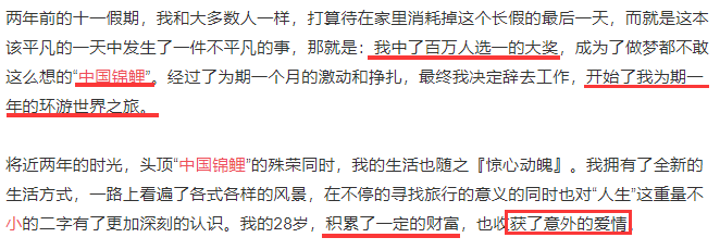 好故事能够成就好的营销,讲故事也属于内容营销的范畴。信小呆将自己中奖的故事通过微博讲述了出来,因自己是锦鲤,信小呆在旅行的路上积累了财富,并收获了爱情,妥妥的人生赢家。