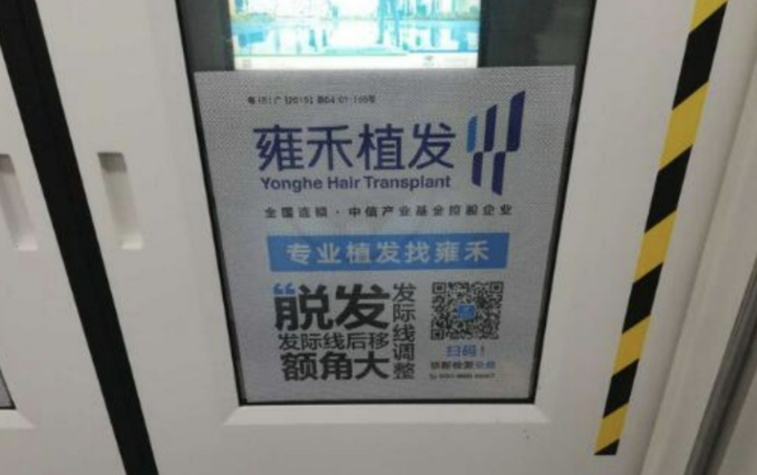 这时,取代医美的则是植发广告,以大家都知道的雍禾植发为例,它在雍禾植发于2020年就曾投放过深圳地铁包车广告,接替了互联网包车的“衣钵”,不过雍禾植发的包列和互联网相比,还是差点美感和创意。