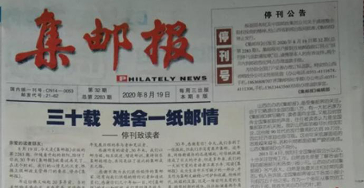 8月25日,澎湃新闻记者查询发现,山西《集邮报》已于“2020集邮周”的第一天2020年8月19日发布《停刊公告》。