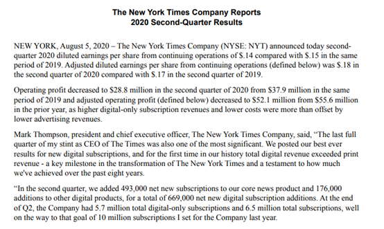 图注:2020年第二季度纽约时报公司收益电话会议电子稿(来源:The New York Times)