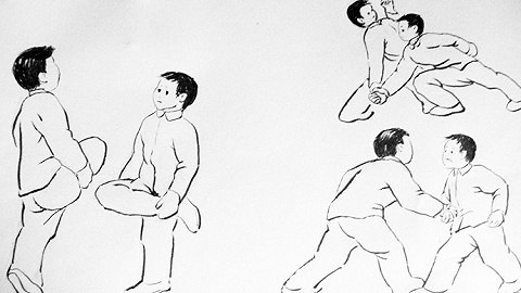 两个人各自搬起一条腿,金鸡独立着,然后以搬起的膝盖互撞。被撞倒的,或是被撞的两腿着地的,这便是出了圈儿的鹌鹑,败了。